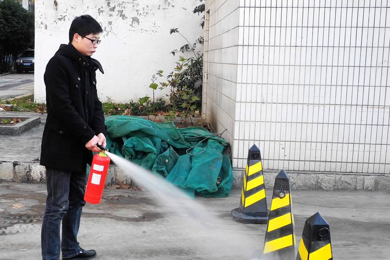 图3. 保卫处防火科李建平科长向同学们演示了灭火毯和灭火器的使用方法