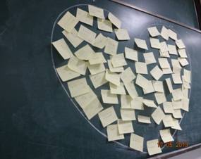 此次活动增设了“心情墙”栏目,每人离场前写一下活动的心情或是建议,贴在黑板上的爱心中,这就更能反映出此次大会的成果了。