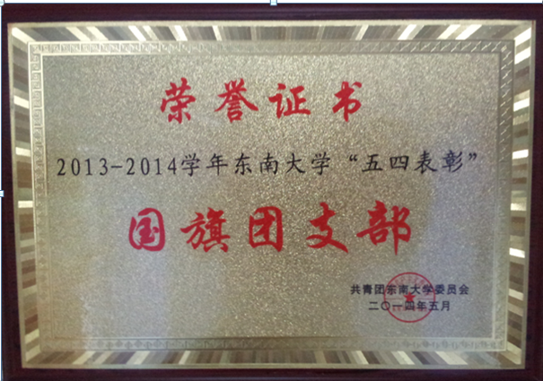 2013-14学年东南大学“五四表彰大会”于5月4日落下帷幕,我院111121团支部在在全校八百多个团支部中脱颖而出,过关斩将,最终荣登前三甲,荣获2013-14学年东南大学“国旗团支部”荣誉称号。