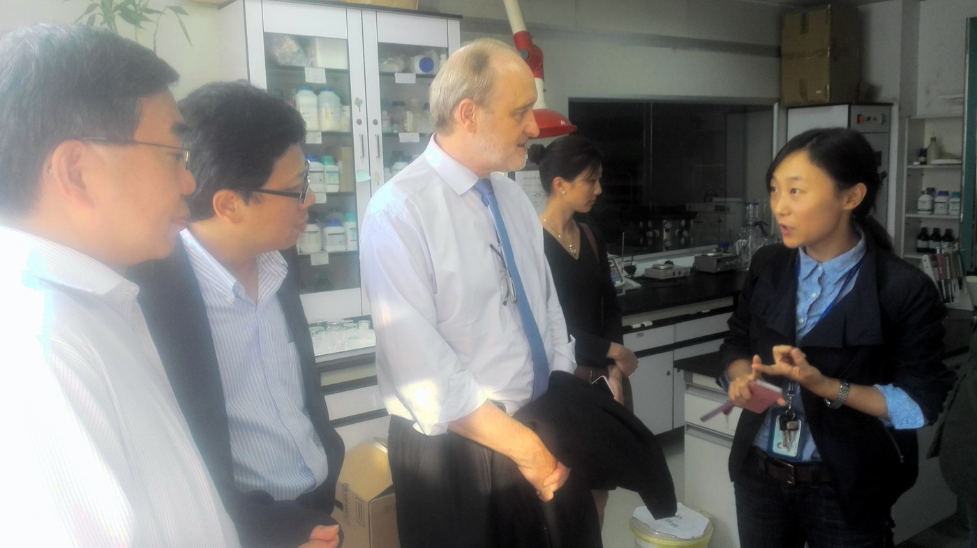 2014年10月28日,美国Georgetown大学医学中心研究院长Robert Clarke教授、生物统计学系主任Tan Ming教授,生物医学研究生教育处Carolin Wu主任, 药物研究Kan Wang教授一行访问我院,参观了丁家桥校区的生物材料与器件省重点实验室,与孙剑飞、熊非和周昕等教授进行了亲切交流。