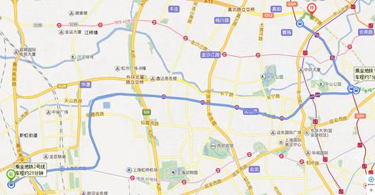 乘坐地铁2号线(广兰路方向)徐泾东站起,江苏路站下车→站内换乘(步行约260米)→乘坐地铁11号线(花桥方向)枫桥路站下车,1号口出→步行如图(全程约1小时)