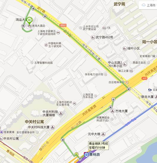 港鸿大酒店步行至地铁3号线曹杨路站,路线如图→乘地铁3号线(宜山路方向)至上海火车站。全程约40分钟,其中步行约1.4公里。