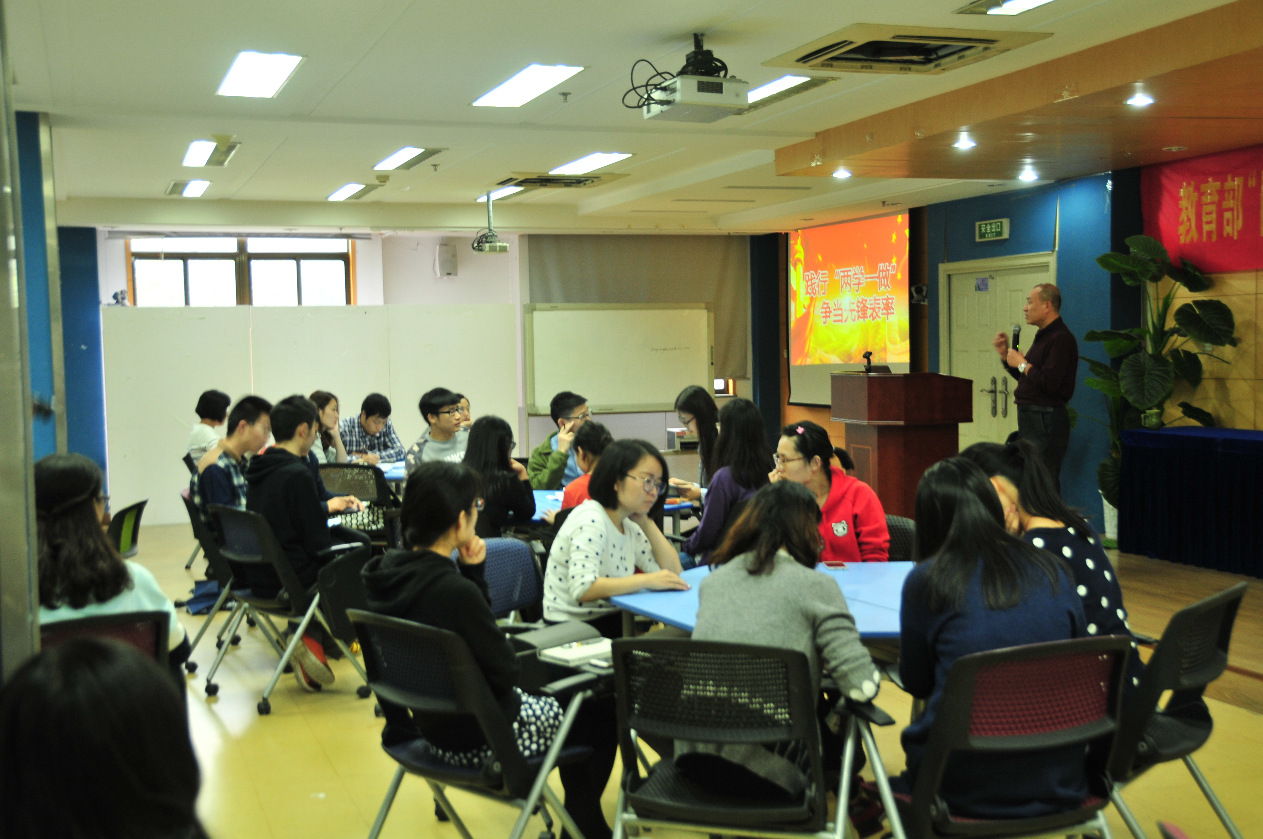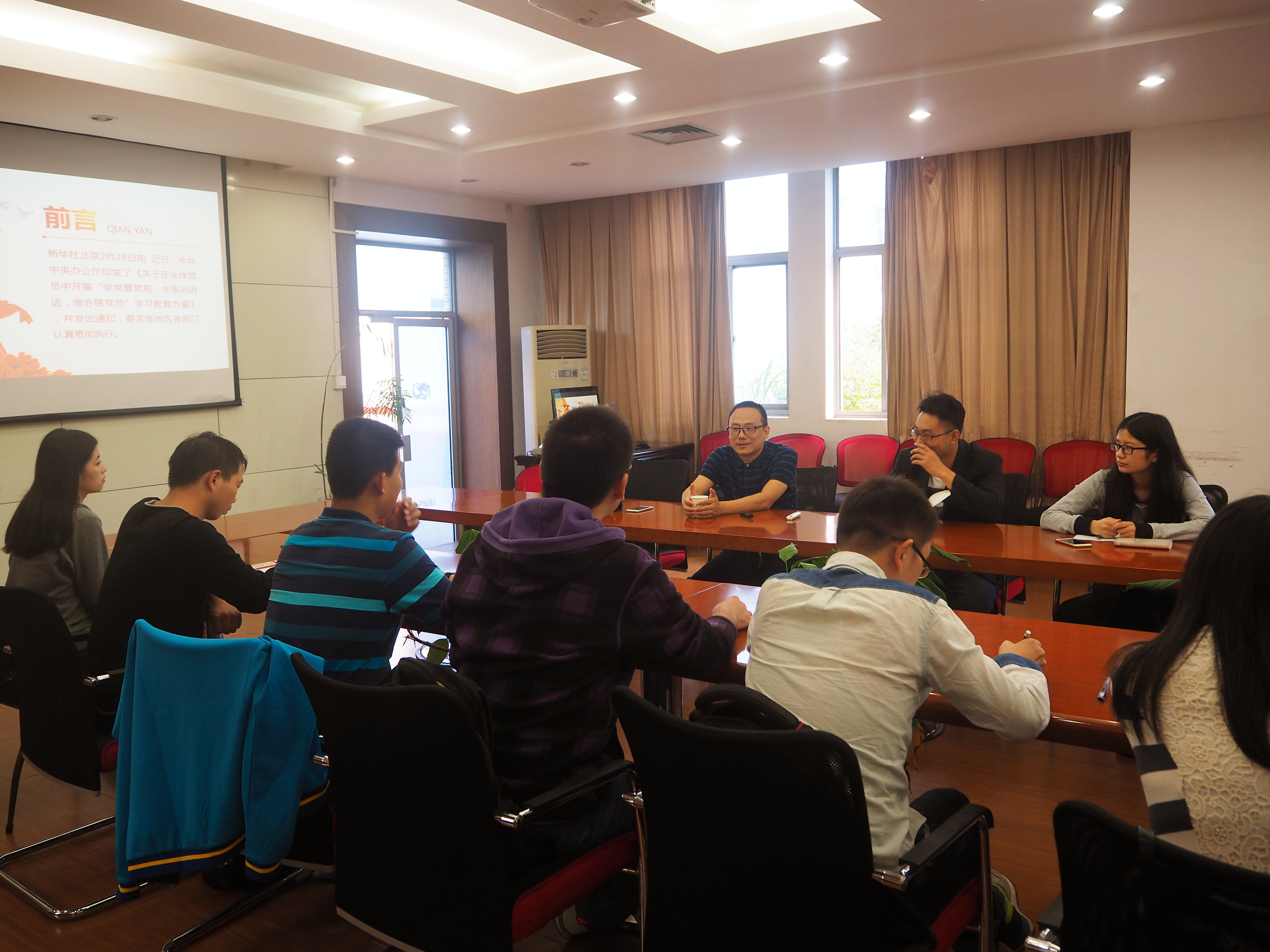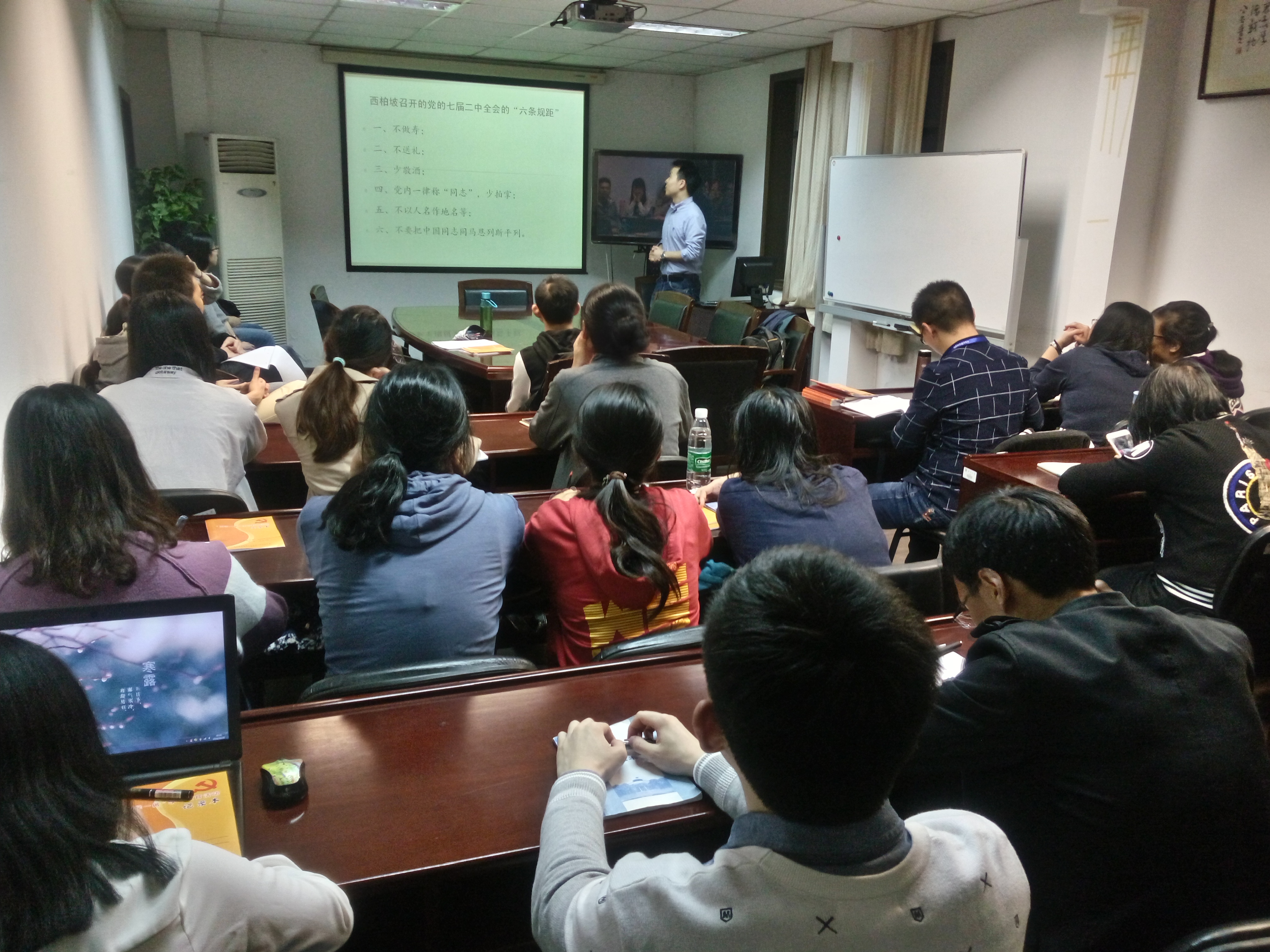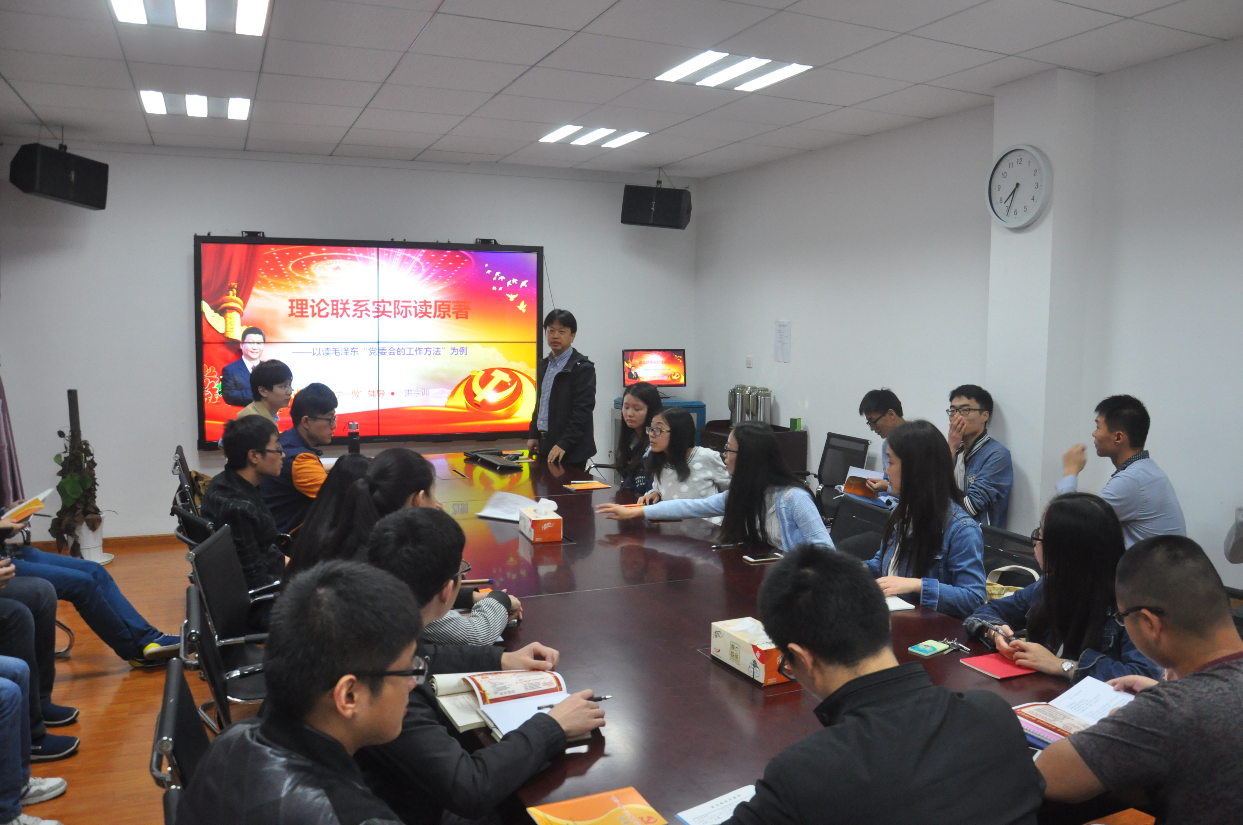 10月18日晚,党委书记洪宗训为硕士141、硕士142、硕士143、硕士144与博士综合支部五个研究生毕业班支部讲解了以《理论联系实际读原著——以读毛泽东“党委会的工作方法”为例》为专题的党课。洪书记首先带领大家详细回顾了“两学一做”的具体内容以及近几个月大家开展活动的情况,然后深入分析了我们应该如何切合自身情况,将“两学一做”开展下去。洪书记结合毛主席选编《党委会的工作方法》谈了两点内容:胸中有“数”、学会“弹钢琴”。毕业班党员要结合自身的科研学习任务及目前的择业的现实,深刻领会把握《党委会的工作方法》的思想精髓,理论联系实际,科学合理高效地处理好各项事务。