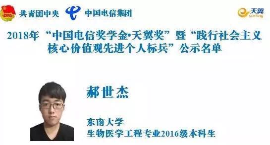 经过三轮遴选,郝世杰从1749名“中国电信奖学金•飞Young奖”候选人中脱颖而出,成为了2018年“中国电信奖学金·天翼奖”暨“践行社会主义核心价值观先进个人标兵”。